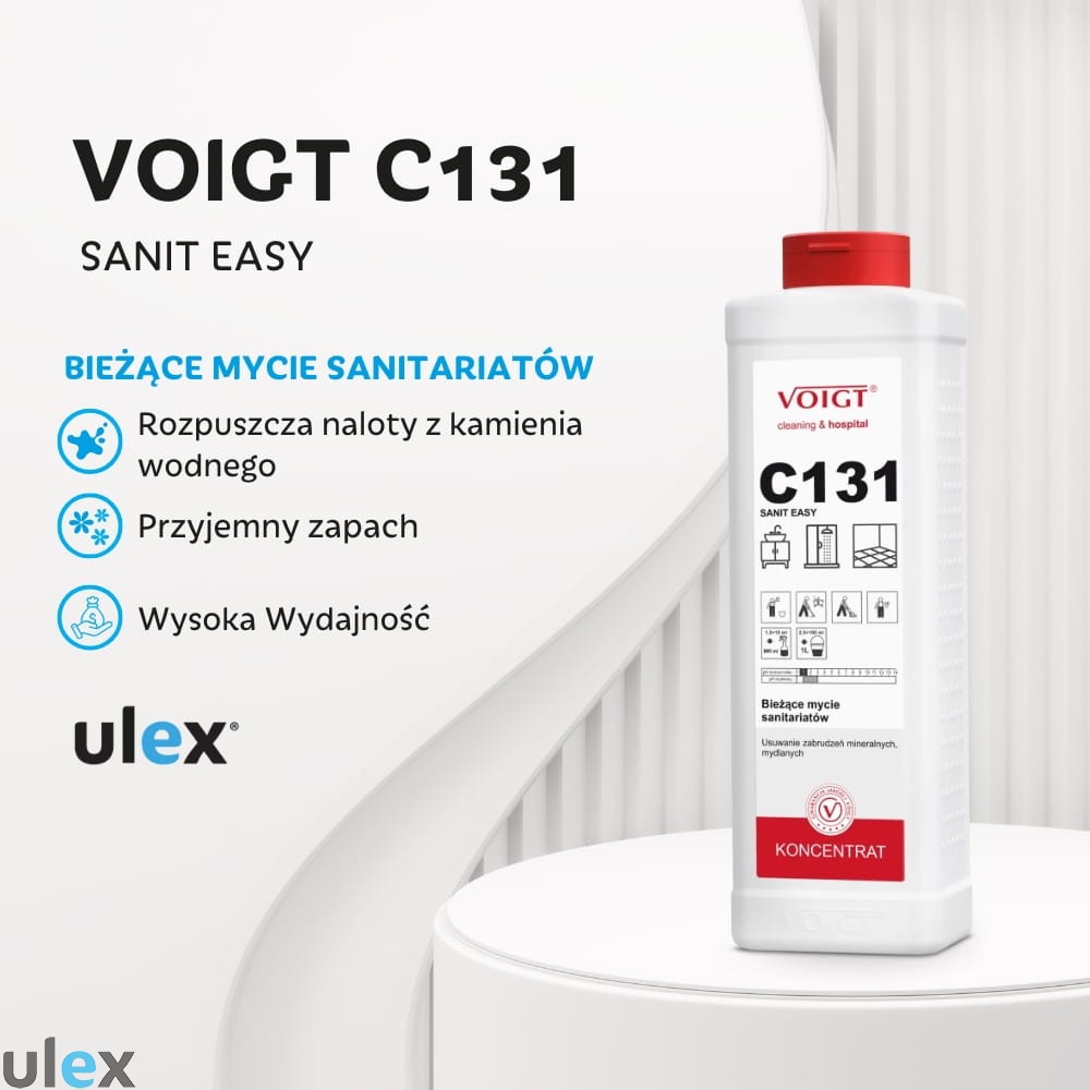 C131 Easy Sanit marki Voigt to profesjonalny koncentrat do czyszczenia powierzchni w pomieszczeniach sanitarnych. Formuła na bazie kwasów organicznych skutecznie usuwa kamień, osady z mydła oraz inne zanieczyszczenia charakterystyczne dla łazienek i toalet. Produkt posiada intensywny, świeży zapach i pozostawia powierzchnie idealnie czyste, bez smug i zacieków.